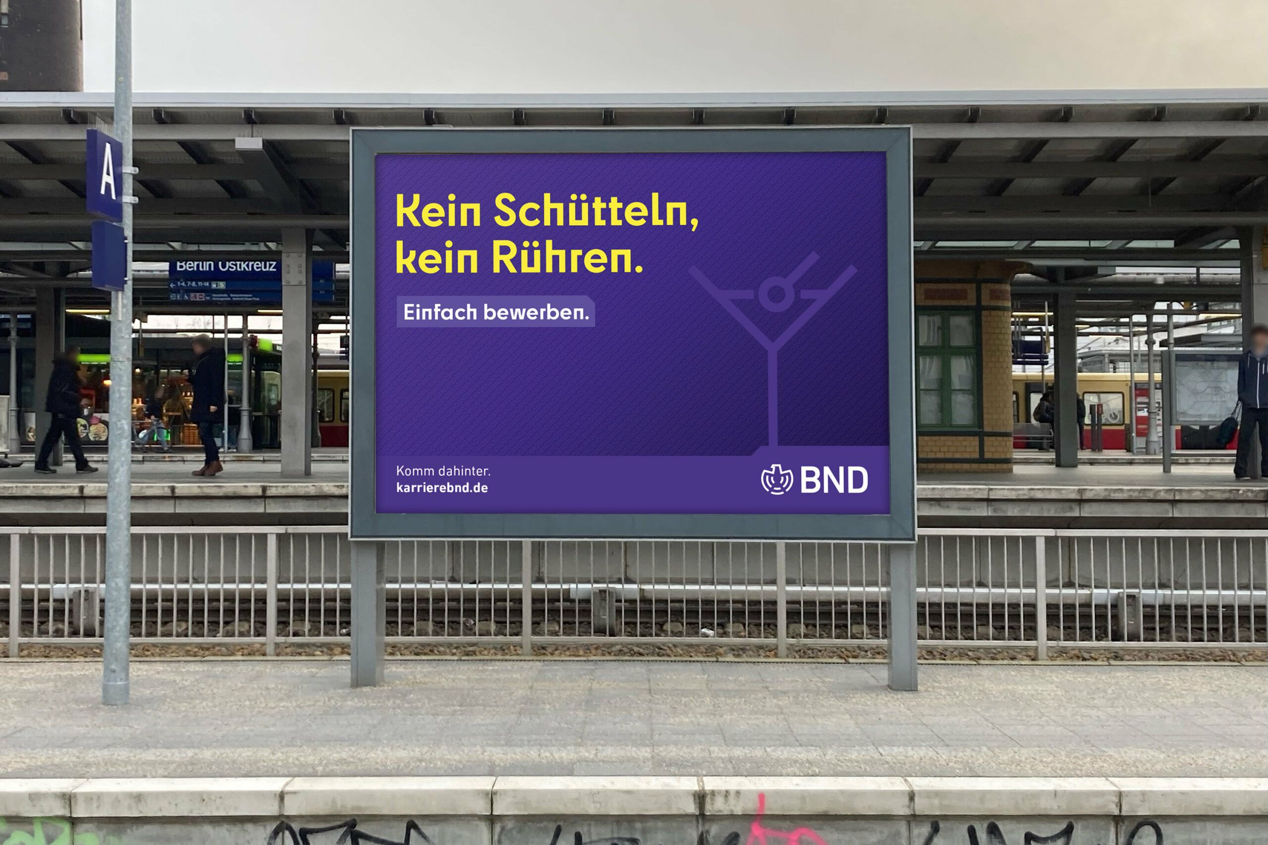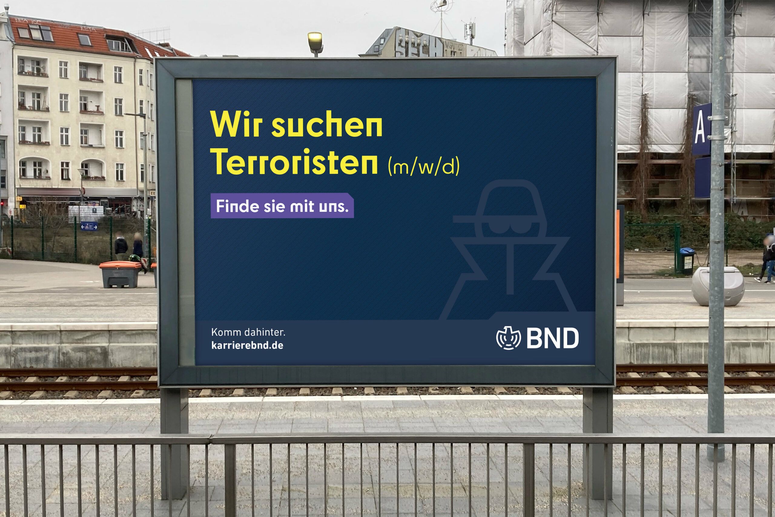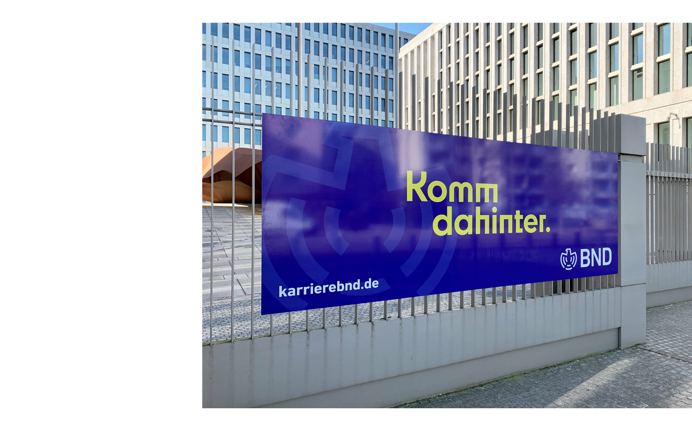 Die neue Arbeitgebermarke startete nach einem vorgelagerten, internen Roll-out mit einer Imagekampagne in Berlin – typisch BND – zunächst im Verborgenen. Im Februar wurden erste Hinweise auf Instagram und in der Presse gestreut. Die Auflösung mittels offizieller Presseinformation wurde von ersten öffentlichkeitswirksamen Kommunikationsmaßnahmen flankiert, darunter eine Projektion an der BND-Zentrale. Nach diesem ersten Schritt an die Öffentlichkeit folgten Mitte März eine Image- und eine Recruiting- Kampagne mit Out-of-Home-Maßnahmen wie großformatigen Plakaten und digitalen Anzeigen sowie Inhalten auf Instagram. Wer dem Aufruf „Komm dahinter“ folgte, konnte auf einer neugestalteten Landingpage die zahlreichen Berufsfelder des BNDs entdecken und sich direkt bewerben. Für große Aufmerksamkeit sorgten vor allem die gezeigten Sprüche wie „Wir suchen Terroristen (m/w/d). Finde sie mit uns.“
