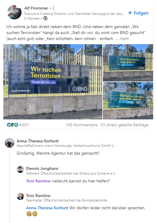 Im Jahrbuch 2024, das die Teilnehmer und Gewinner sowie ihre Kampagnen dokumentiert, wurde die verantwortliche Agentur des BND zunächst geheimnisvoll zurückgehalten. Nachträglich erfolgt nun eine Korrektur durch Namensnennung (vgl. Jahrbuch 2024, S. 4-7), um die erbrachte Leistung der Agentur zu würdigen. Damit schafft der Bundesnachrichtendienst nicht nur Sichtbarkeit, sondern auch Gerechtigkeit – schließlich trug die Agentur den Hauptanteil zur Umsetzung seiner ‚Komm dahinter‘-Kampagne bei.