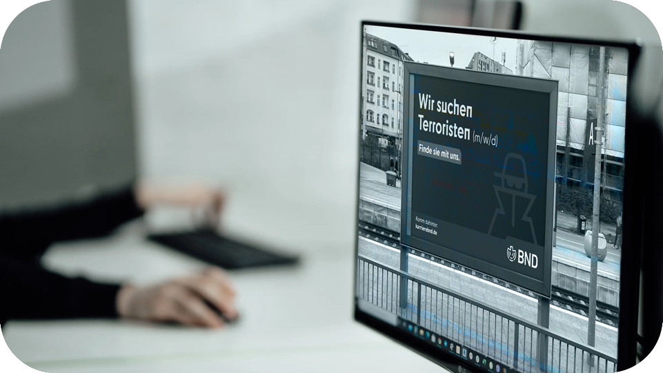 Mit kreativen, jugendlich geprägten Slogans wie „Stell dir vor, DU wirst vom BND gesucht – als Teil des Teams“ startete der Bundesnachrichtendienst (BND) 2024 eine aufmerksamkeitsstarke Kampagne zur Nachwuchsgewinnung. Das Ergebnis? Die Bewerberzahl hat sich verdoppelt – ein Erfolg, zu dem wir stolz beitragen durften.